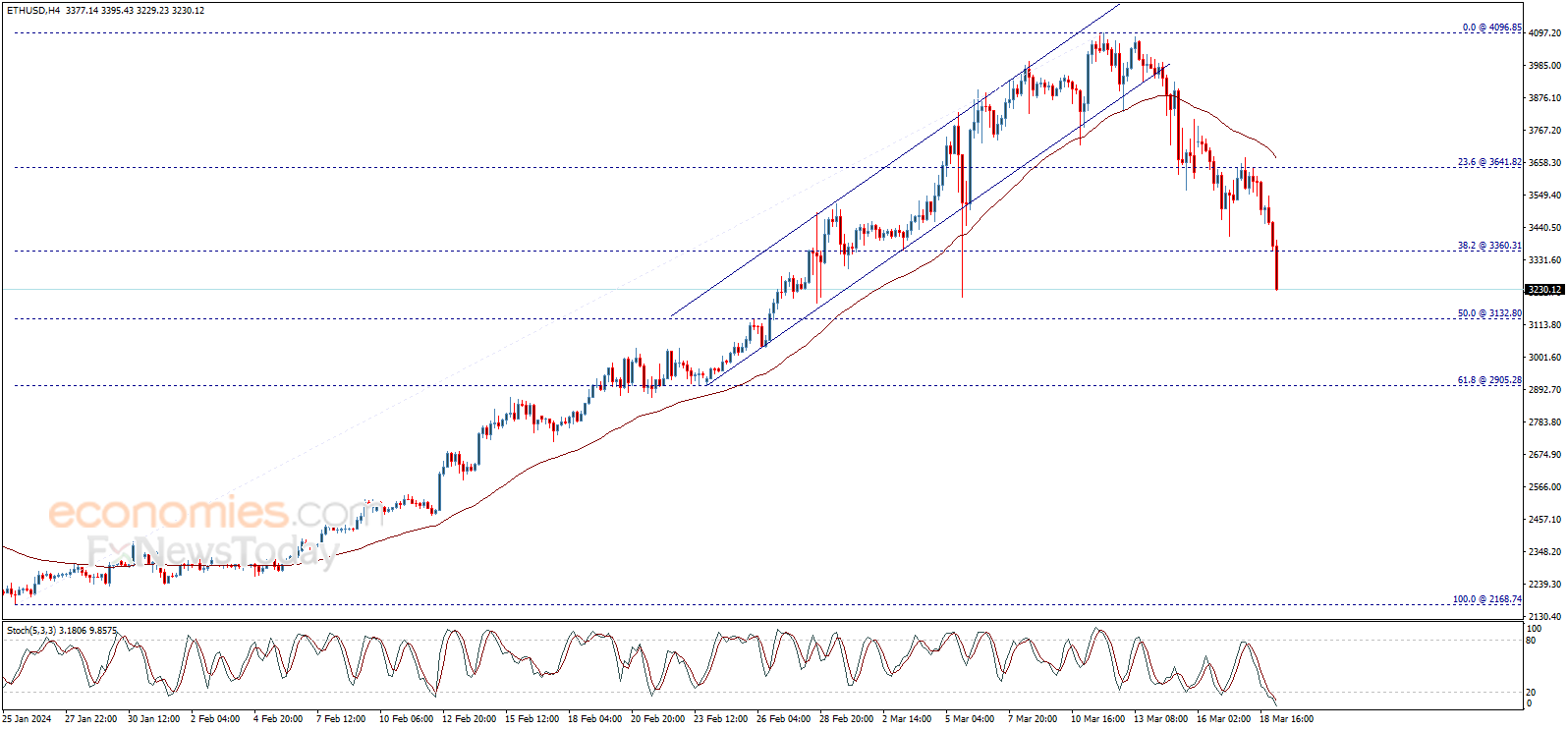 تجاوز سعر الإيثريوم (ETHUSD) هدفنا المنتظر عند 3360.31 ليؤكد استمرار سيطرة الاتجاه التصحيحي الهابط، ويقترب من الهدف التالي المتوقع عند 3132.80، ويبدو المجال مفتوحاً أمام تخطّي هذا المستوى لتكبّد خسائر إضافية تصل إلى 2905.30.