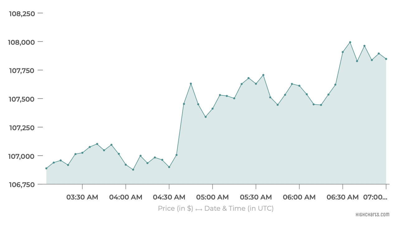 سعر البيتكوين على بُعد أقل من 2% من سعر ATH: هل يمكن لسعر البيتكوين أن يصل إلى 110,000 دولار أمريكي اليوم بعد تسجيل أعلى مستوى خلال اليوم عند 107,950 دولار أمريكي. أي بفارق 1.86% عن المستوى التاريخي للبيتكوين؟