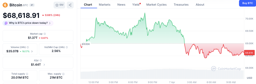 في الوقت نفسه، بلغ سعر البيتكوين 68,618 دولارًا أمريكيًا، مسجلًا انخفاضًا بنسبة 0.68% وقت كتابة هذا التقرير. ومع ذلك، ارتفع حجم التداول بأكثر من 18%، مما يدل على نشاط مكثف خلال فترة الانخفاض.